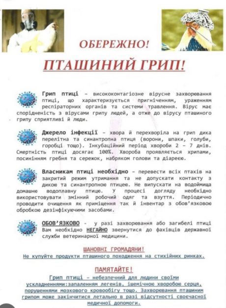 Проводяться всі заходи щодо ліквідації і недопущення розповсюдження захворювання грипу птиці відповідно до Інструкції з профілактики та ліквідації грипу птиці затвердженої наказом Міністерства аграрної політики та продовольства України № 547 від 17.10.2011 року.