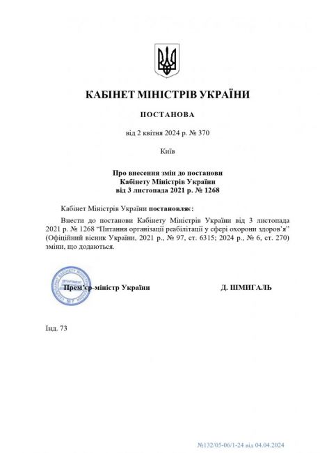 Кабінетом Міністрів України прийнято постанову від 02 квітня 2024 року № 370 "Про внесення змін до постанови Кабінету Міністрів України від 3 листопада 2021р. № 1268"