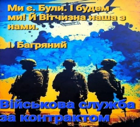 Захисти близьких, збережи країну для дітей та онуків – приєднуйся до ЗСУ! На військову службу за контрактом приймаються громадяни України віком від 18 до 45 років.
