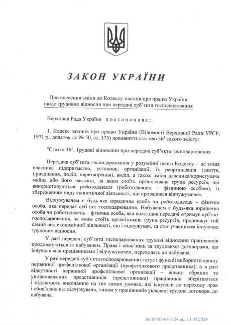 Підприсано Закон, прийнятий Верховною Радою України 25 квітня 2024 року № 3677-IX "Про звнесення зміни до Кодексу законів щодо трудових відносин при передачі суб’єкта господарювання", який набирає чинності з дня, наступного за днем його опублікування.