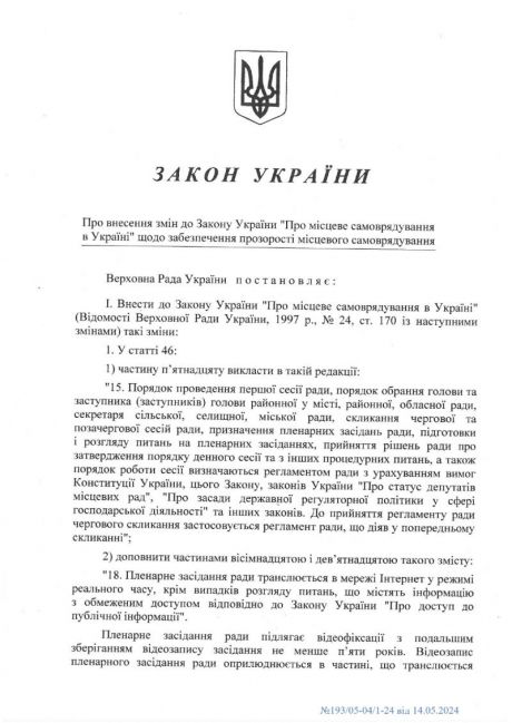 Підприсано Закон, прийнятий Верховною Радою України 22 лютого 2024 року № 3590-IX "Про звнесення змін до Закону України "Про місцеве самоврядування" щодо забезпечення прозорості місцевого самоврядування", який набирає чинності з дня, наступного за днем його опублікування, окрім деяких виключень.