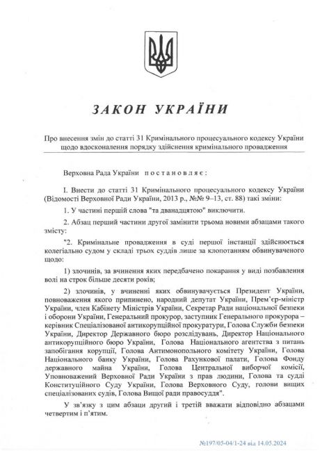 Підприсано Закон, прийнятий Верховною Радою України 24 квітня 2024 року № 3655-IX "Про внесення зміни до статті 31 Кримінального процесуального кодексу України щодо вдосконалення порядку здійснення кримінального провадження", який набирає чинності з дня, наступного за днем його опублікування.