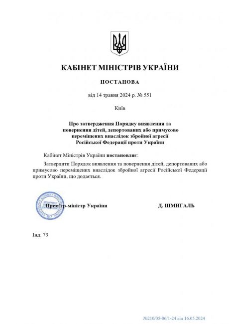 Кабінетом Міністрів України прийнято постанову від 14 травня 2024 року № 551 "Про затвердження Порядку виявлення та повернення дітей, депортованих або примусово переміщених внаслідок збройної агресії Російської Федерації проти України"