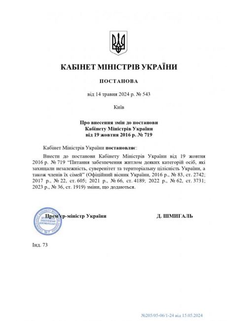 Кабінетом Міністрів України прийнято постанову від 14 травня 2024 року № 543 "Про внесення змін до постанови Кабінету Міністрів України від 19 жовтня 2016 р. № 719"