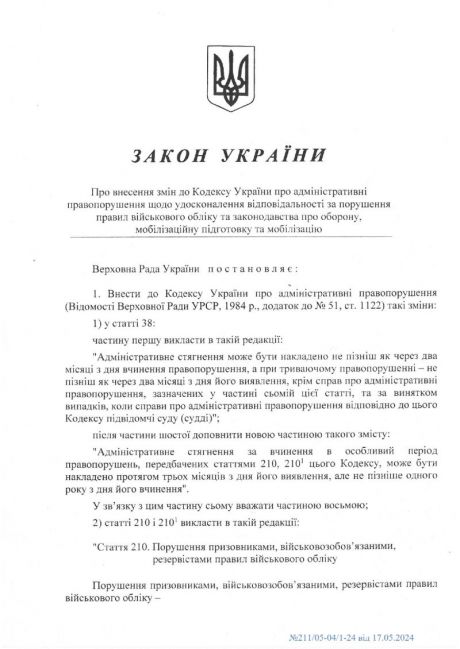 Підписано Закон, прийнятий Верховною Радою України 9 травня 2024 року № 3696-IX "Про внесення змін до Кодексу про адміністративні правопорушення щодо удосокналення відповідальності за порушення правил військового обліку та законодавства про оборону, мобілізаційну підготовку та мобілізацію", який набирає чинності з дня, наступного за днем його опублікування.