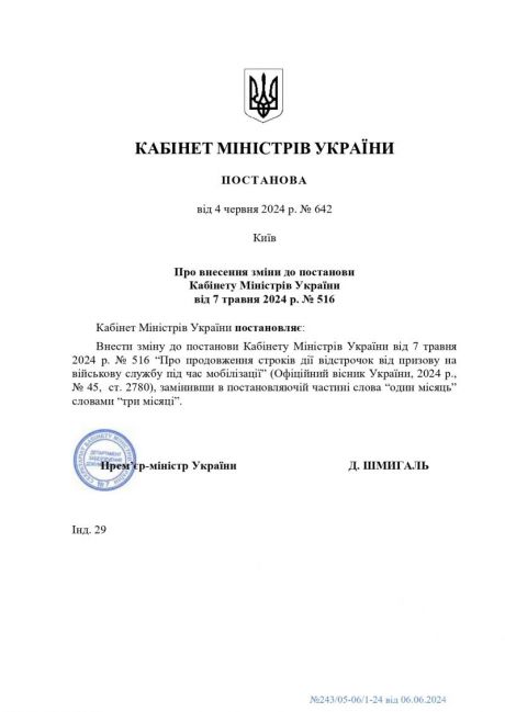 Кабінетом Міністрів України прийнято постанову від 30 травня 2024 року № 622 "Про внесення зміни до постанови Кабінету Міністрів України від 7 травня 2024 р. № 516".