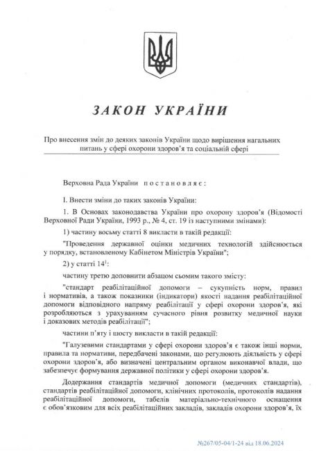 Підписано Закон, прийнятий Верховною Радою України 22 травня 2024 року № 3728-IX "Про внесення змін до деяких Законів України щодо вирішення нагальних питань у сфері охорони здоров’я та соціальній сфері", який набирає чинності через 3 місяці наступного за днем його опублікування, крім пунктів 2 і 3 Прикінцевих та перехідних положень, які набирають чинності з дня, наступного за днем опублікування цього Закону.