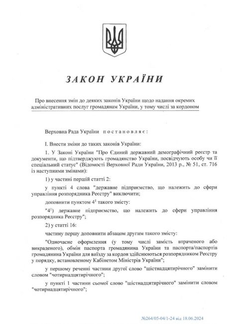 Підписано Закон, прийнятий Верховною Радою України 9 травня 2024 року № 3709-IX "Про внесення змін до деяких законів України щодо надання окремих адміністративних послуг громадянам України, в тому числі за кордоном", який набирає чинності через два місяці з дня його опублікування, крім пункту 2 Прикінцевих положень, який набирає чинності з дня, наступного за днем опублікування цього Закону.