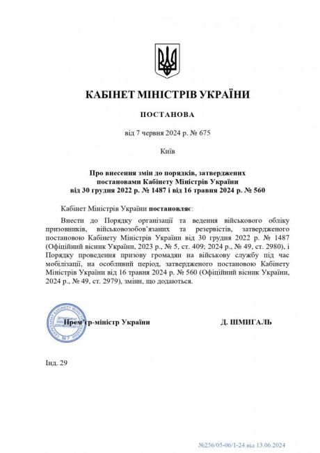 Кабінетом Міністрів України прийнято постанову від 7 червня 2024 року № 675 "Про внесення змін до порядків, затверджених постановами Кабінету Міністрів України від 30 грудня 2022 р. № 1487 і від 16 травня 2024 р. № 560".