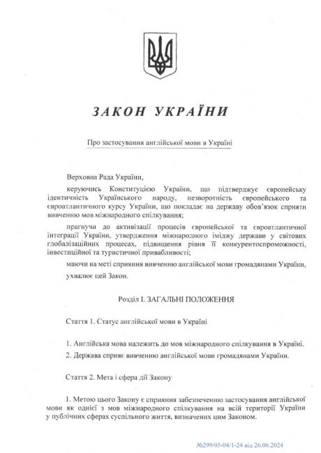 Підписано Закон, прийнятий Верховною Радою України 04 червня 2024 року № 3760-IX "Про застосування англійської мови в Україні", який набирає чинності з дня його опублікування, крім деяких пунктів.