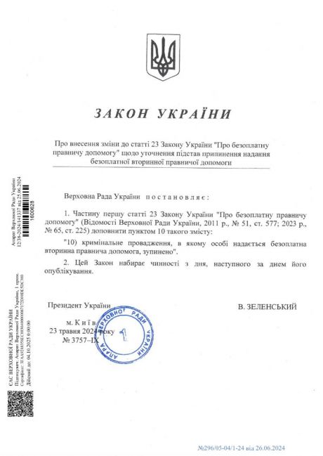 Підписано Закон, прийнятий Верховною Радою України 23 травня 2024 року № 3757-IX "Про внесення зміни до статті 23 Закону України "Про безоплатну правничу допомогу" щодо уточнення підстав припинення надання безоплатної вторинної правничої допомоги", який набирає чинності з дня, наступного за днем його опублікування.