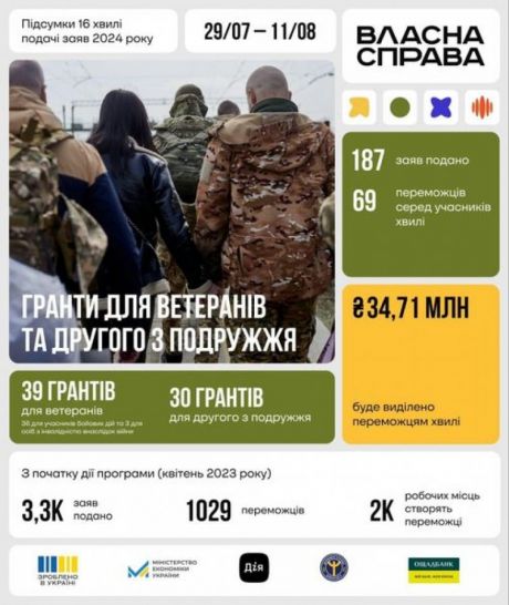 Зокрема, як повідомляє Міністерство економіки України, за підсумками 16-ої хвилі у 2024 році 69 ветеранів або членів їхніх родин отримають 35 млн гривень. Серед них: