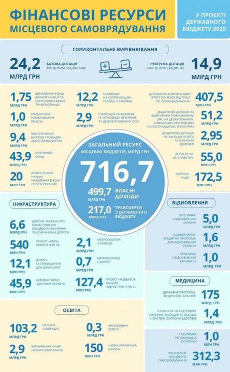 13 вересня Кабінет Міністрів України схвалив проєкт Закону України "Про Державний бюджет України на 2025 рік". Згідно з розрахунками Уряду, загальний обсяг фінансового ресурсу місцевих бюджетів на 2025 рік становитиме 716,7 млрд грн, у тому числі: доходи місцевих бюджетів – 499,7 млрд грн; трансферти з державного бюджету – 217 млрд грн.