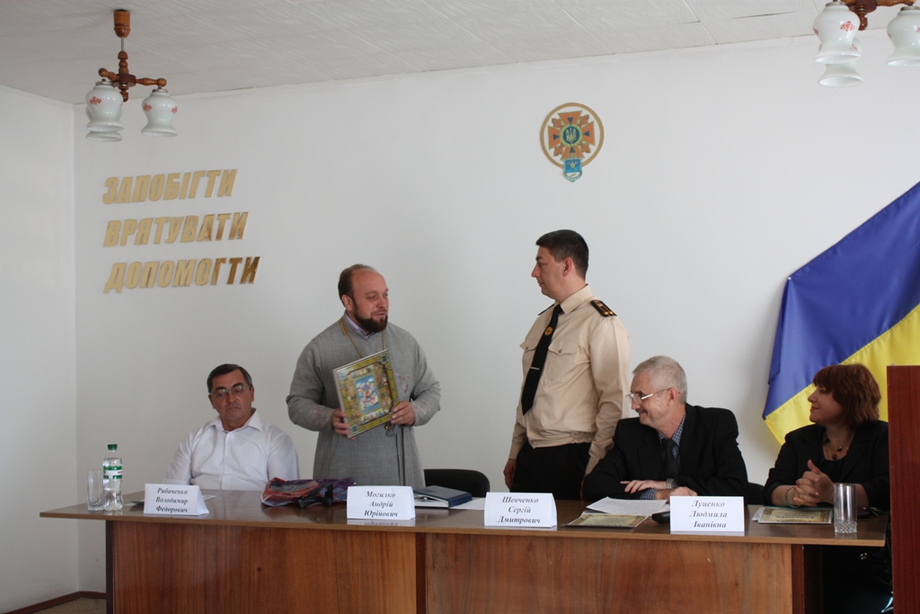 Привітавши колектив та ветеранів цивільної служби, начальник державної пожежної рятувальної частини Андрій Могилко надав словоблагочинному Баштансьго району настоятелю Свято-Пантелеймонівського храму протоієрею Віталію Сопіжуку, який звернувся з молитвенним побажанням до рятівників та подарував ікону Неопалима Купина, яка є оберегом від пожеж.