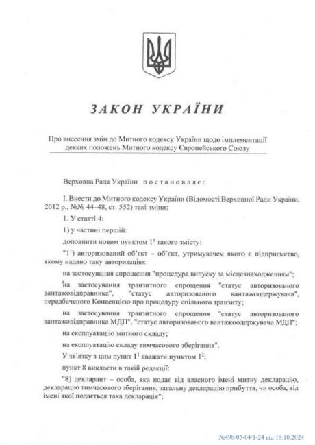 Підписано Закон, прийнятий Верховною Радою України 22 серпня 2024 року № 3926-IX "Про внесення змін до Митного кодексу України щодо імплементації деяких положень Митного кодексу Європейського Союзу", який набирає чинності через шість місяців з дня, наступного за днем його опублікування, крім абзаців третього і четвертого підпункту 2 та абзаців третього і четвертого підпункту 3 пункту 6, пунктів 102, 193, 196, 200, абзаців двадцять першого - двадцять дев’ятого підпункту 7 пункту 254 розділу I цього Закону (щодо доповнення розділу XXI "Прикінцеві та перехідні положення" Митного кодексу України пунктами 9-45-9-48) та пункту 2 розділу II цього Закону, які набирають чинності з дня, наступного за днем його опублікування..