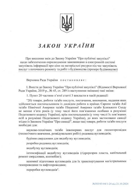 Підписано Закон, прийнятий Верховною Радою України 19 вересня 2024 року № 3988-IX "Про внесення змін до Закону України "Про публічні закупівлі" щодо забезпечення оприлюднення замовниками в електронній системі закупівель інформації про ціни на матеріальні ресурси інформації про ціни на матеріальні ресурси під час закупівель послуг з поточного ремонту та робіт з будівництва (прозоре будівництво)", який набирає чинності з дня, наступного за днем його опублікування, крім абзаців шостого і сьомого підпункту 1 пункту 4 розділу 1 цього Закону, які набирають чинності через 60 днів з дня набрання чинності цим Законом.