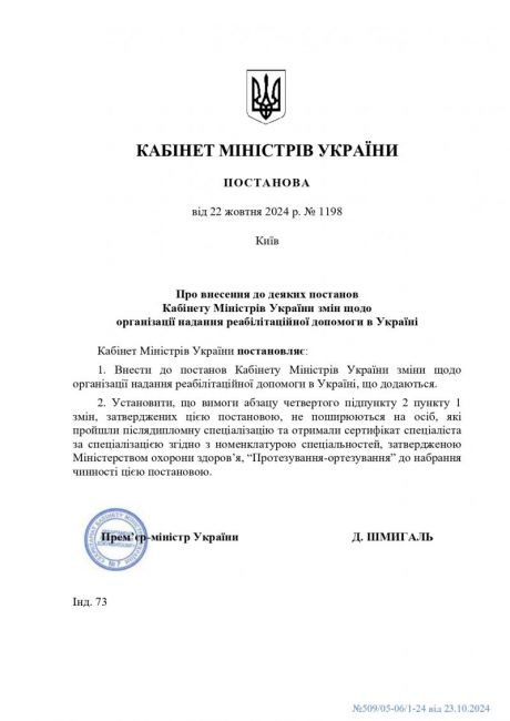Кабінетом Міністрів України прийнято постанову від 22 жовтня 2024 року № 1198 "Про внесення до деяких постанов Кабінету Міністрів України змін щодо надання реабілітаційної допомоги в Україні"