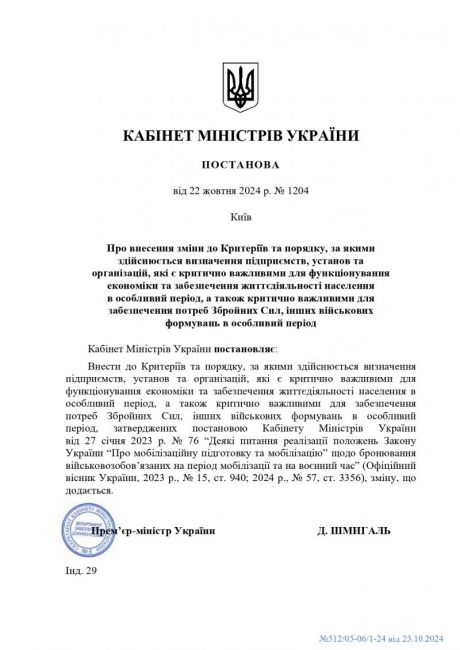 Кабінетом Міністрів України прийнято постанову від 22 жовтня 2024 року № 1204 "Про внесення зміни до Критегріїв та порядку, за якими здійснюється визначення підприємств, установ та лрганізацій, які є критично важливими для функціонування економіки та забезпечення життєдіяльності населення в особливий період, а також критично важливими для забезпечення потреб Зюройних Сил, інших військових формувань".