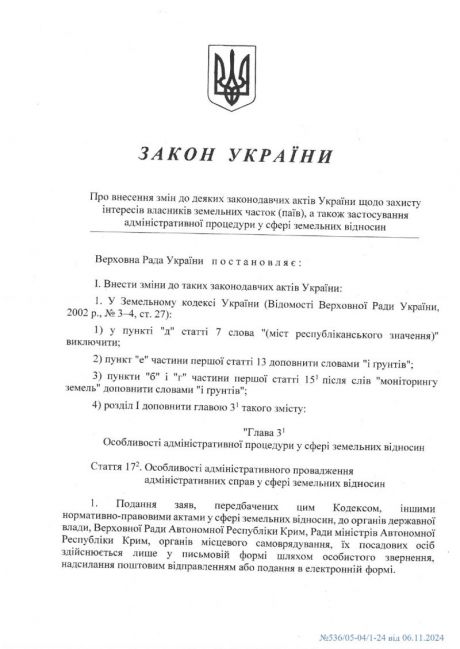 Підписано Закон, прийнятий Верховною Радою України 8 жовтня 2024 року № 3993-IX "Про внесення змін до деяких законодавчих актів України щодо захисту інтересів власників земельних часток (паїв), а також застосування адміністративної процедури у сфері земельних відносин", який набирає чинності з дня його опублікування, крім:
