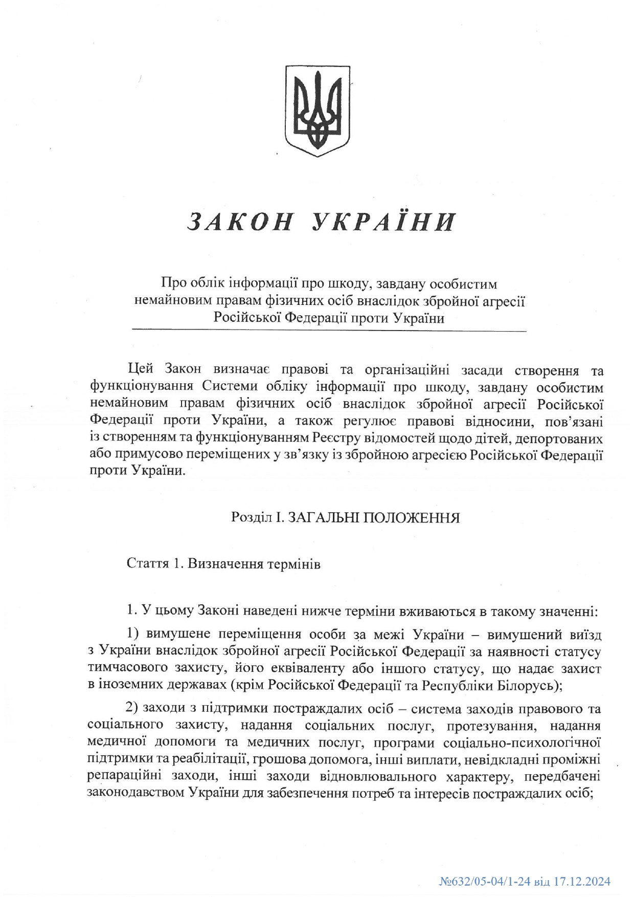 Підписано Закон, прийнятий Верховною Радою України від 20 листопада 2024 року № 4071-IX "Про облік інформації про шкоду, завдану особистим немайновим правам фізичних осіб внасліок збройної агресіії Російської Федерації проти України", який набирає чинності через один місяць з дня його опублікування, крім пункту 4 розділу ІV, який набирає чинності з дня опублікування цього Закону, та розділу ІІ цього Закону, який вводиться в дію з дня початку функціонування Реєстру відомостей щодо депортованих дітей.