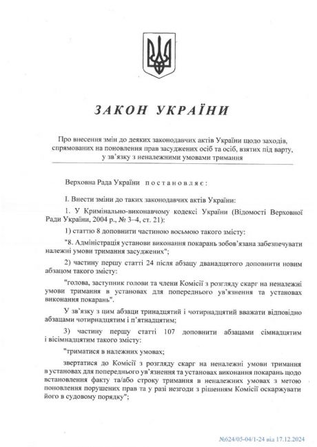 Підписано Закон, прийнятий Верховною Радою України від 21 листопада 2024 року № 4093-IX "Про внесення змін до деяких законодавчих актів України щодо заходів, спрямованих на поновлення прав засуджених осіб та осіб, взятих під варту, у зв’язку з неналежними учовами утримання", який набирає чинності з дня, наступного за днем його опублікування.