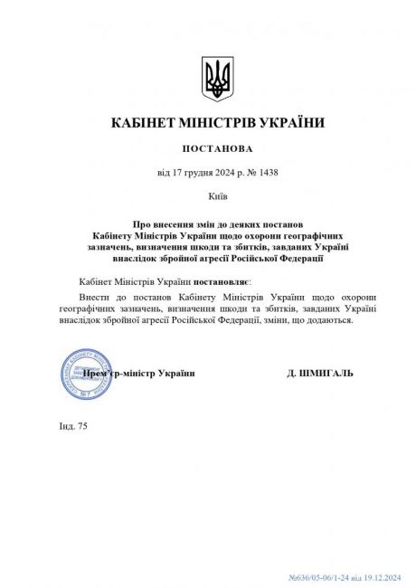 Кабінетом Міністрів України затверджено постанову від 17 грудня 2024 року № 1438 "Про внесення змін до деяких постанов Кабінету Міністрів України щодо охорони географічних зазначень, визначення шкоди та збитків, завданих Україні внаслідок збройної агресії Російської Федерації".
