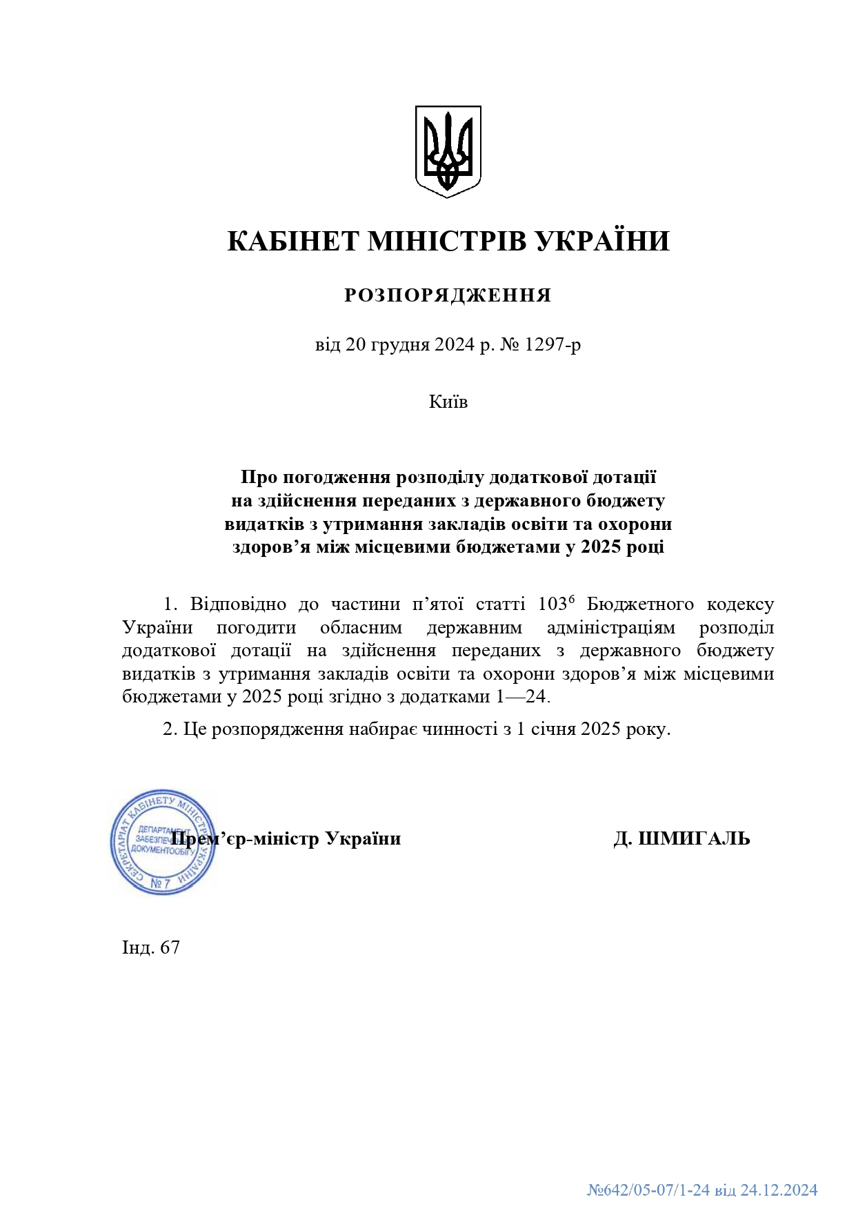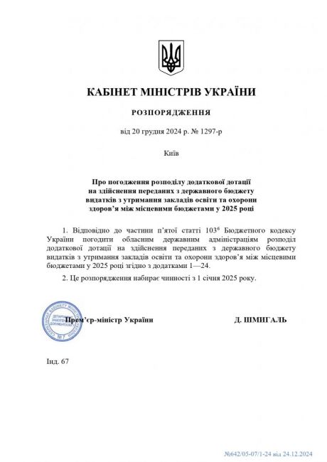 Кабінетом Міністрів України прийнято розпорядження від 20 грудня 2024 року № 1219-р "Про погодження розподілу додаткової дотації на здійснення переданих з державного бюджету видатків з утримання закладів освіти та охорони здоров’я між місцевими бюджетами у 2025 році".