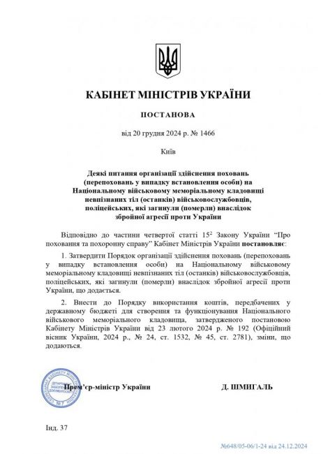 Кабінетом Міністрів України затверджено постанову від 20 грудня 2024 року № 1466 "Деякі питання організації здійснення поховань (перепоховань у випадку встановлення особи) на Національному військовому меморіальному кладовищі невпізнаних тіл (останків) військовослужбовців, поліцейських, які загинули (померли) внаслідок збройної агресії проти України".