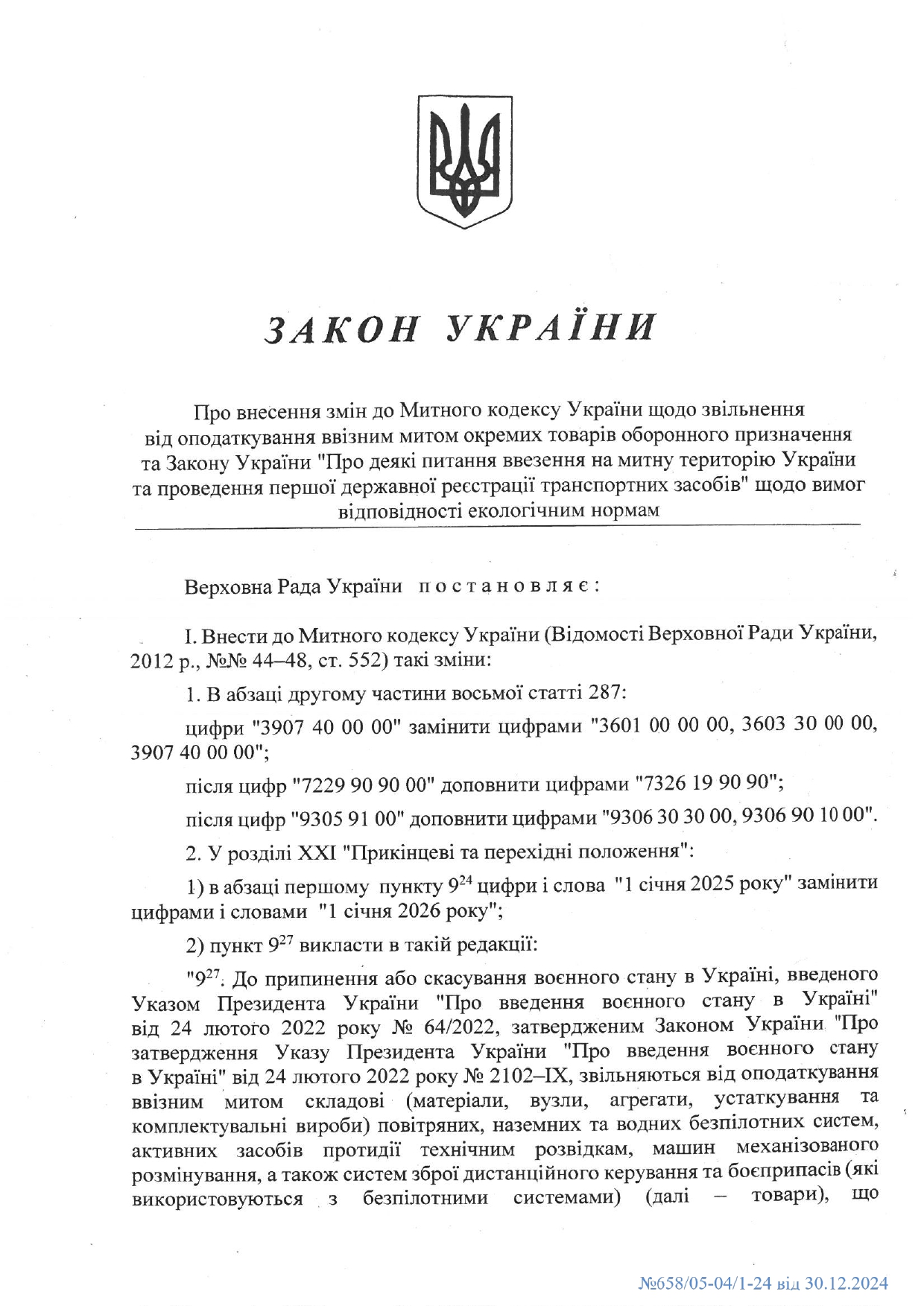 Підписано Закон, прийнятий Верховною Радою України від 4 грудня 2024 року № 4111-IX "Про внесення змін до Митного кодексу України щодо звільнення від оподаткування ввізним митом окремих товарів оборонного призначення та Закону України "Про деякі питання ввезення на митну територію України та проведення першої державної реєстрації транспортних засобів" щодо вимог відповідності екологічним нормам".
