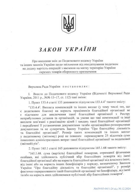 Підписано Закон, прийнятий Верховною Радою України від 17 грудня 2024 року № 4143-IX "Про внесення змін до Податкового кодексу України та інших законів України щодо звільнення від оподаткування податком на додану вартість операцій з ввезення на митну територію України окремих товарів оборонного призначення".