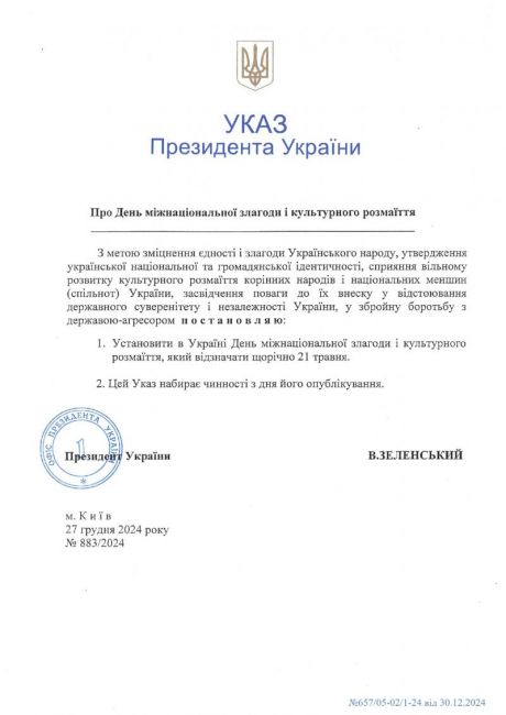 Президентом України 27 грудня 2024 року підписано указ № 883/2024 "Про День міжнаціональної злагоди і культурного розмаїття", який набирає чинності з дням його опублікування.