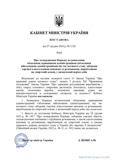 Кабінетом Міністрів України затверджено постанову від 27 грудня 2024 року № 1528 "Про затвердження Порядку встановлення обласними державними адміністраціями (обласними військовими адміністраціями) під час воєнного стану заборони торгівлі алкогольними напоями та речовинами, виробленими на спиртовій основі, у визначений період доби".