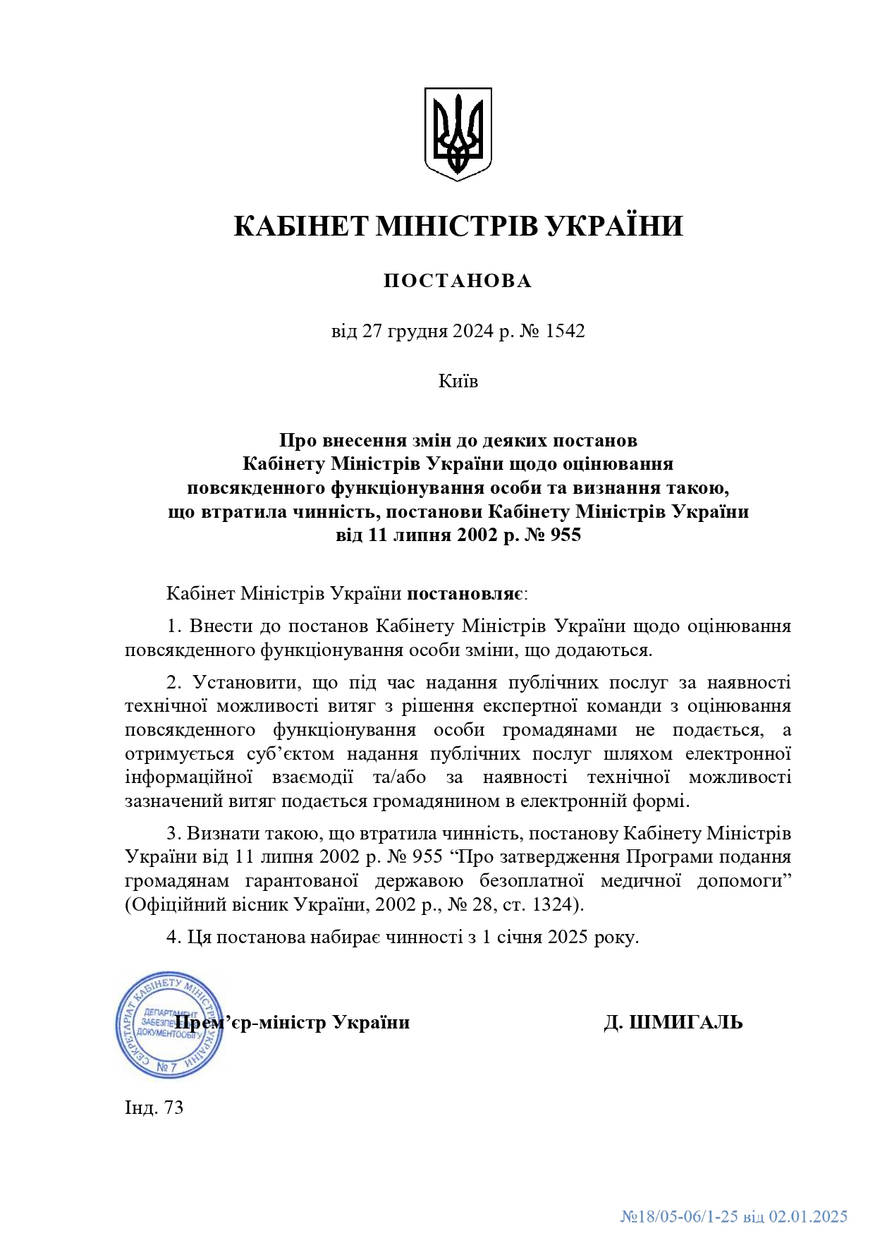 Кабінетом Міністрів України затверджено постанову від 27 грудня 2024 року № 1542 "Про внесення змін до деяких постанов Кабінету Міністрів України щодо оцінювання повсякденного функціонування особи та визнання такою, що втратила чинність, постанови Кабінету Міністрів України від 11 липня 2002 р. № 955".