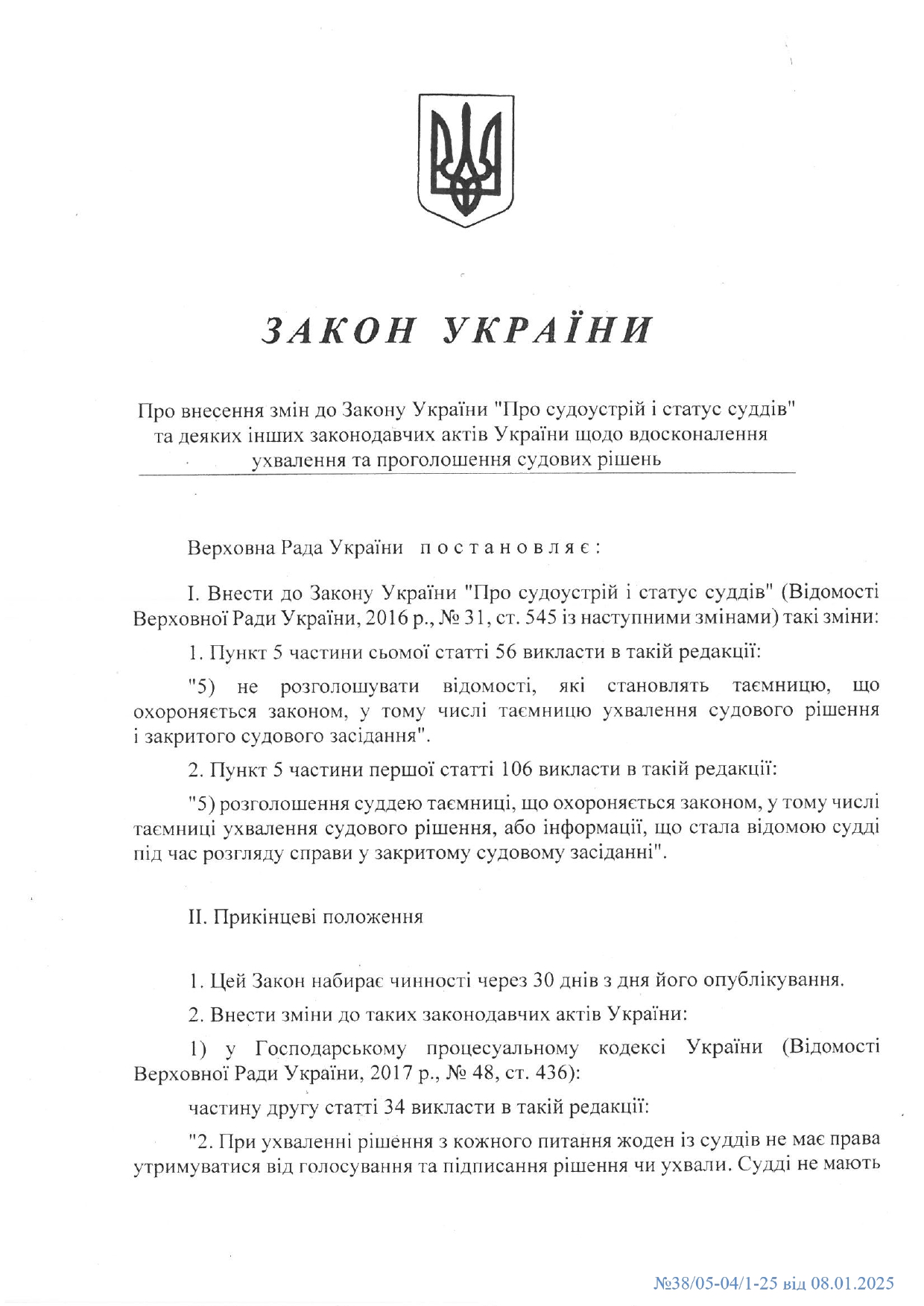 Підписано Закон, прийнятий Верховною Радою України від 19 грудня 2024 року № 4173-IX "Про внесення змін до Закону України "Про судоустрій та статус суддів" та деяких інших законодавчих актів України щодо вдосконалення ухвалення та проголошення судових рішень".