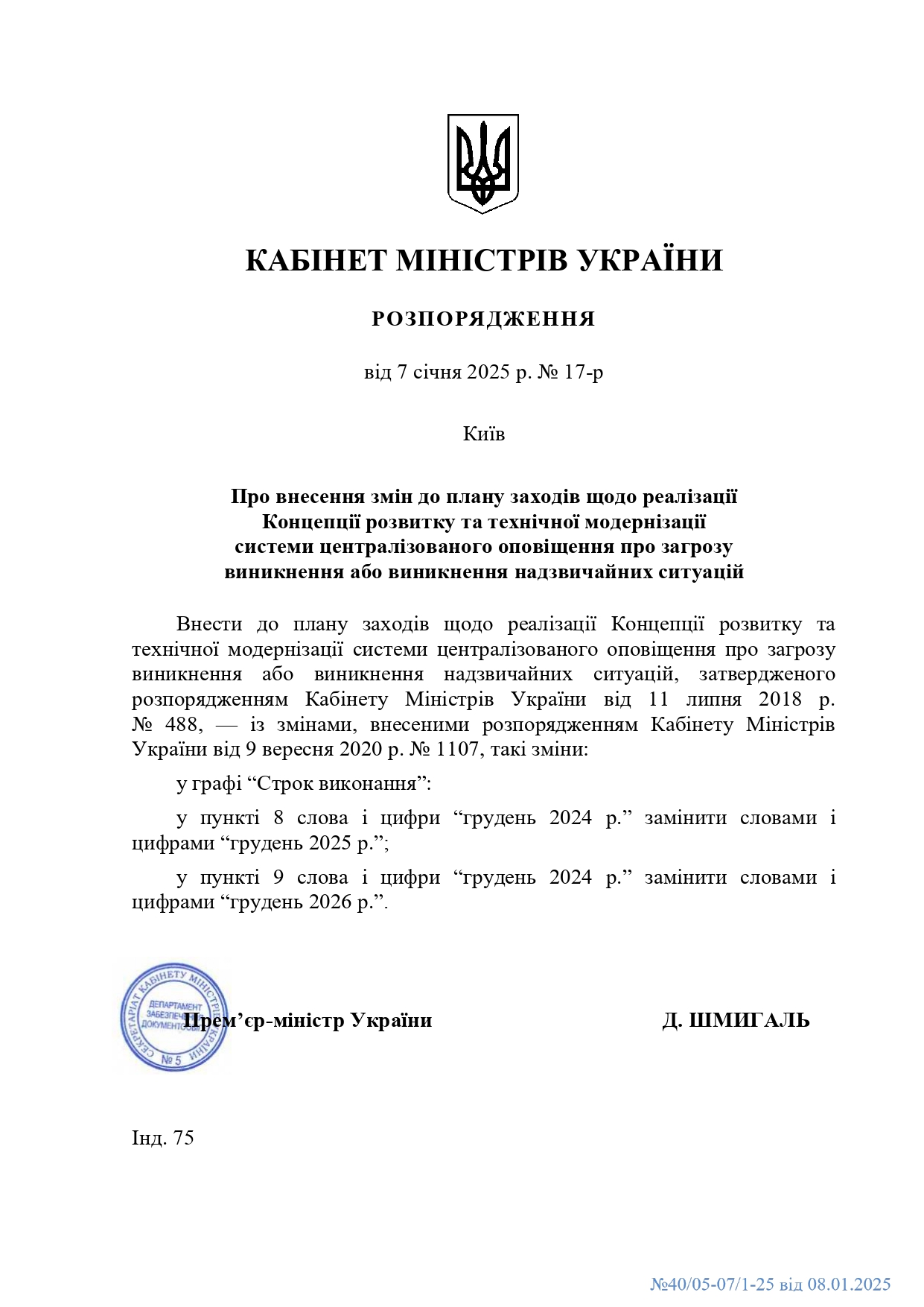 Кабінетом Міністрів України прийнято розпорядження від 7 січня 2025 року № 17-р "Про внесення змін до плану заходів щодо реалізації Концепції розвитку та технічної модернізації системи централізованого оповіщення про загрозу виникнення або виникнення надзвичайних ситуацій".