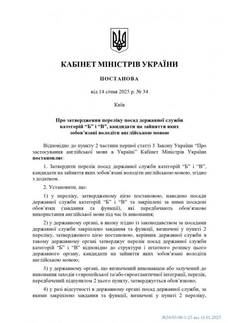 Кабінетом Міністрів України затверджено постанову від 14 січня 2025 року № 34 "Про затвердження переліку посад державної служби категорій “Б” і “В”, кандидати на зайняття яких зобов’язані володіти англійською мовою".