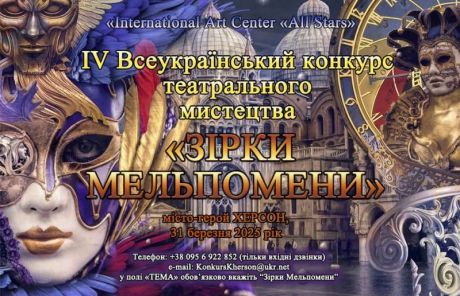 Запрошуємо взяти участь у «IV Всеукраїнському конкурсі театрального мистецтва «ЗІРКИ МЕЛЬПОМЕНИ» (дистанційна участь), місто-герой ХЕРСОН, 31 березня 2025 року!