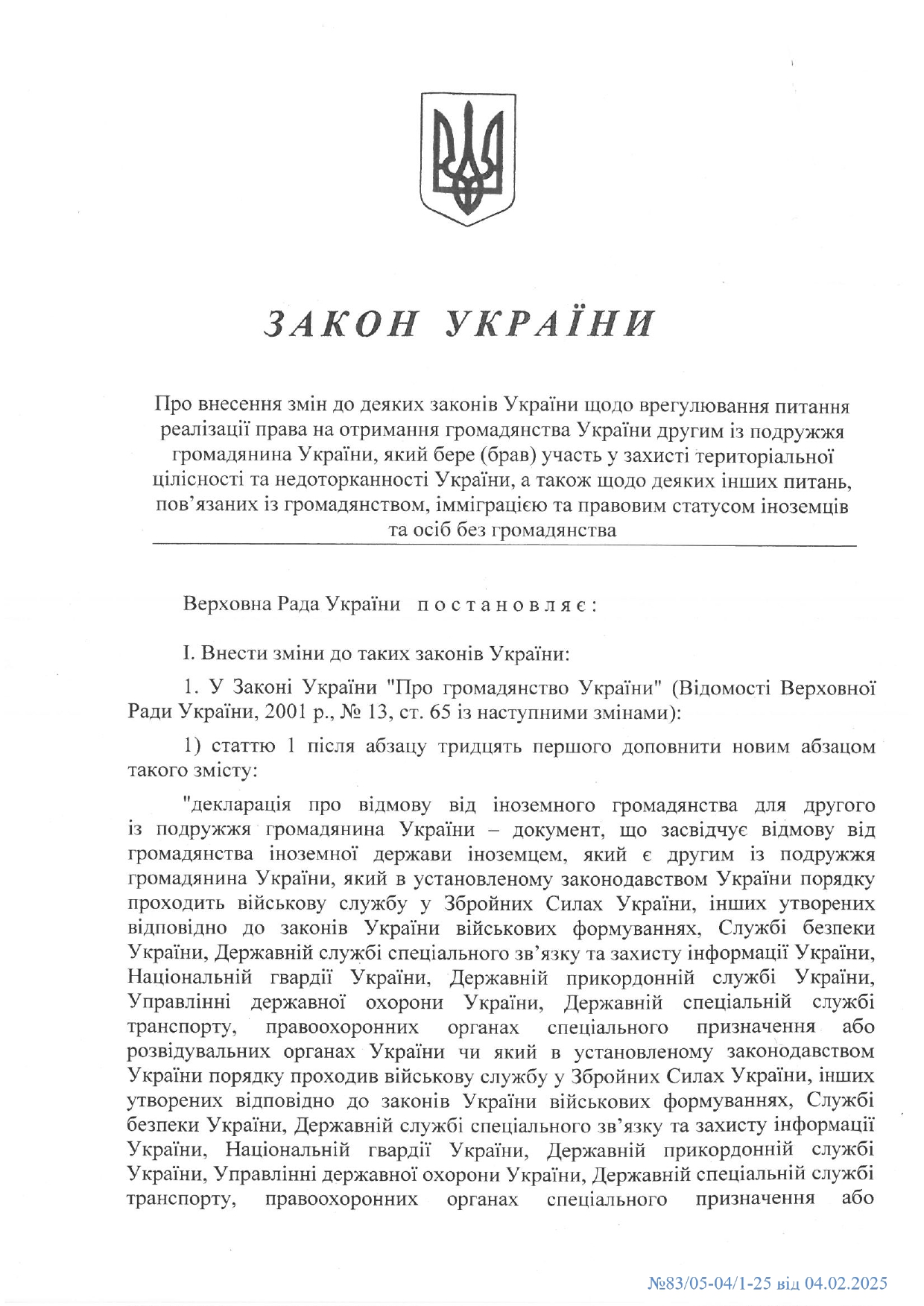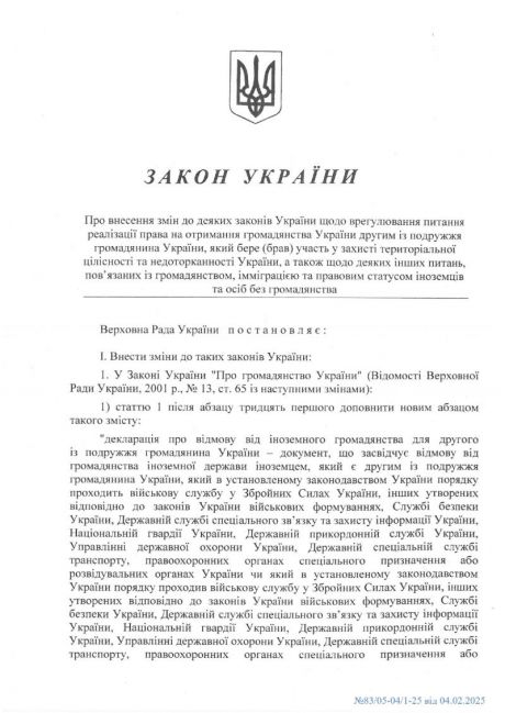 Підписано Закон, прийнятий Верховною Радою України від 8 січня 2025 року № 4191-IX "Про внесення змін до деяких законів України щодо врегулювання питання реалізації права на отримання громадянства України другим із подружжя громадянина України, який бере (брав) участь у захисті територіальної цілісності та недоторканності України, а також щодо деяких інших питань, пов’язаних із громадянством, іміграцією та правовим статусом іноземців та осіб без громадянства".