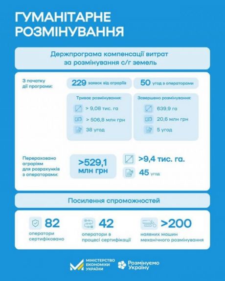За цей період оператори протимінної діяльності (ПМД) завершили очищення 5 ділянок в межах програми компенсації. Загальна вартість операцій склала 20,6 млн гривень.