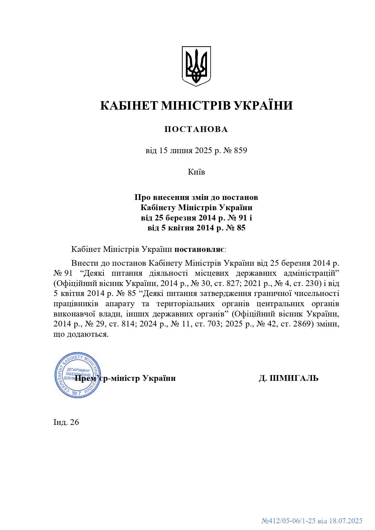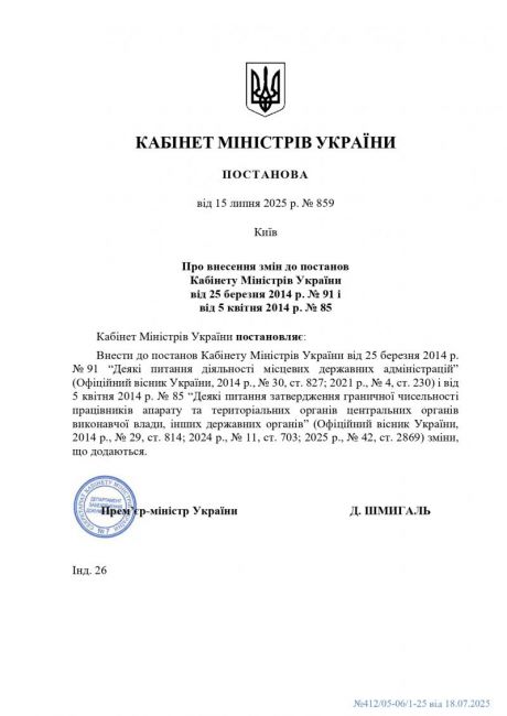 Кабінетом Міністрів України затверджено постанову від 15 липня 2025 року № 859 "Про внесення змін до постанов Кабінету Міністрів України від 25 березня 2014 р. № 91 і від 5 квітня 2014 р. № 85”.