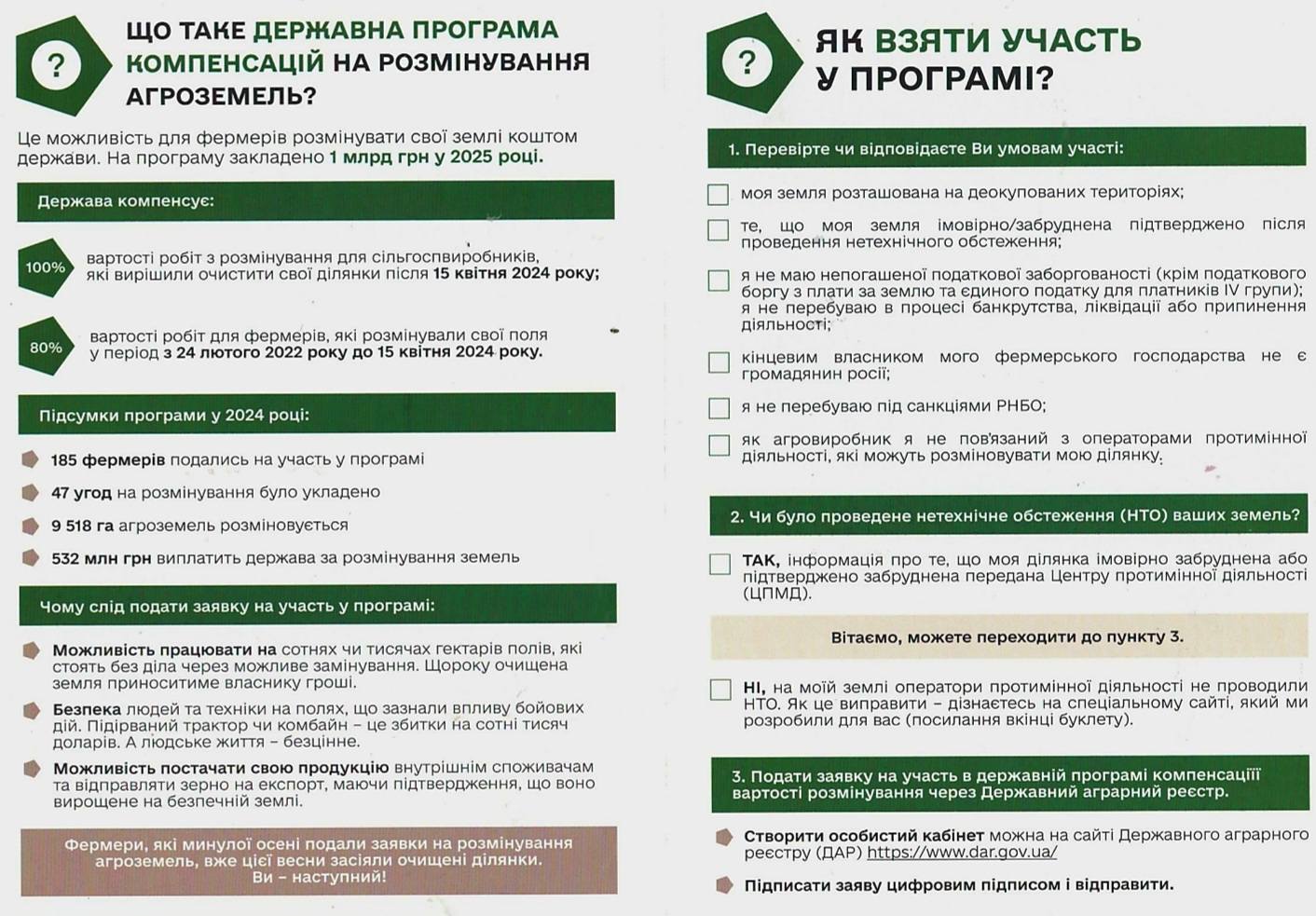 Баштанська районна військова адміністрація повідомляє, що з метою відновлення роботи агропромислової галузі на деокупованих територіях та підтримки продовольчої безпеки держави, Урядом України у 2024 році запроваджено механізм компенсації витрат за гуманітарне розмінування земель сільськогосподарського призначення.