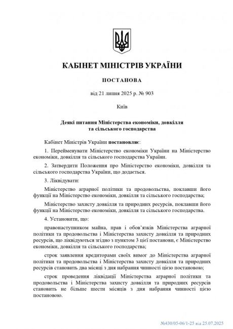 Кабінетом Міністрів України затверджено постанову від 21 липня 2025 року № 903 "Деякі питання Міністерства економіки, довкілля та сільського господарства”.