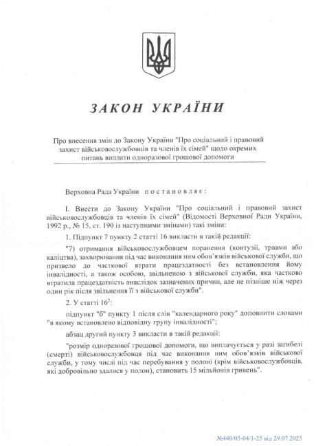Підписано Закон, прийнятий Верховною Радою України від 16 липня 2025 року № 4546-IX "Про внесення змін до Закону України "Про соціальний і правовий захист військовослужбовців та членів їх сімей" щодо окремих питань виплати одноразової грошової допомоги".
