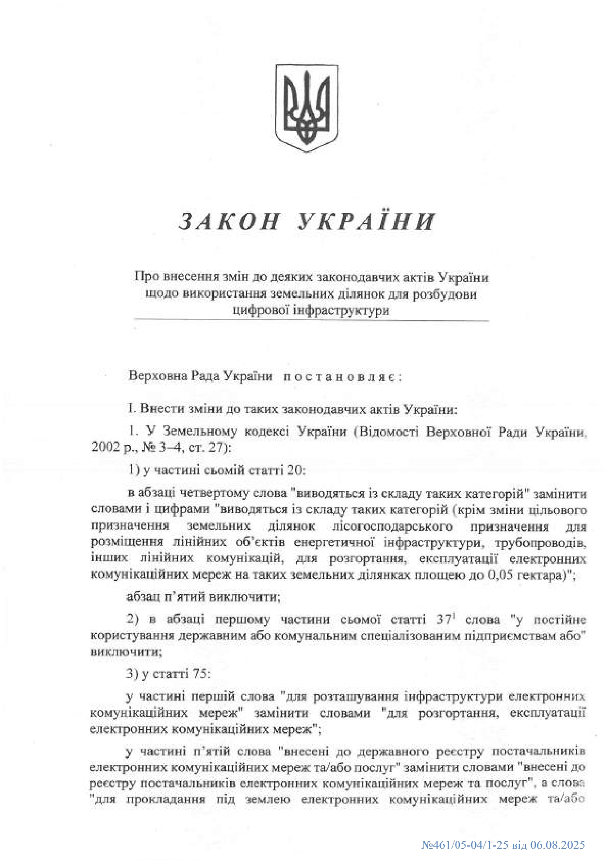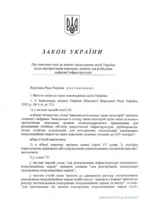 Підписано Закон, прийнятий Верховною Радою України від 25 березня 2025 року № 4321-IX "Про внесення зміни до деяких законодавчих актів України щодо використання земельних ділянок для розбудови цифрової інфраструктури".