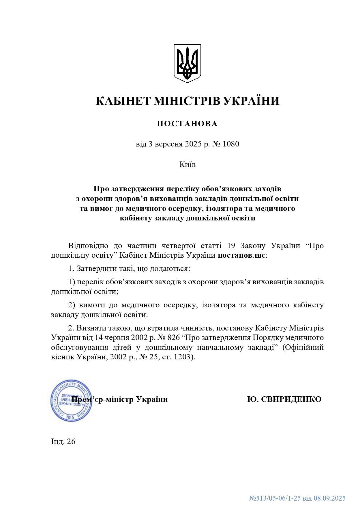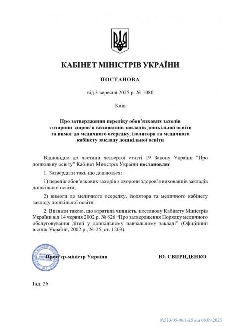 Кабінетом Міністрів України затверджено постанову від 3 вересня 2025 року № 1080 "Про затвердження переліку обов’язкових заходів з охорони здоров’я вихованців закладів дошкільної освіти та вимог до медичного осередку, ізолятора та медичного кабінету закладу дошкільної освіти”.