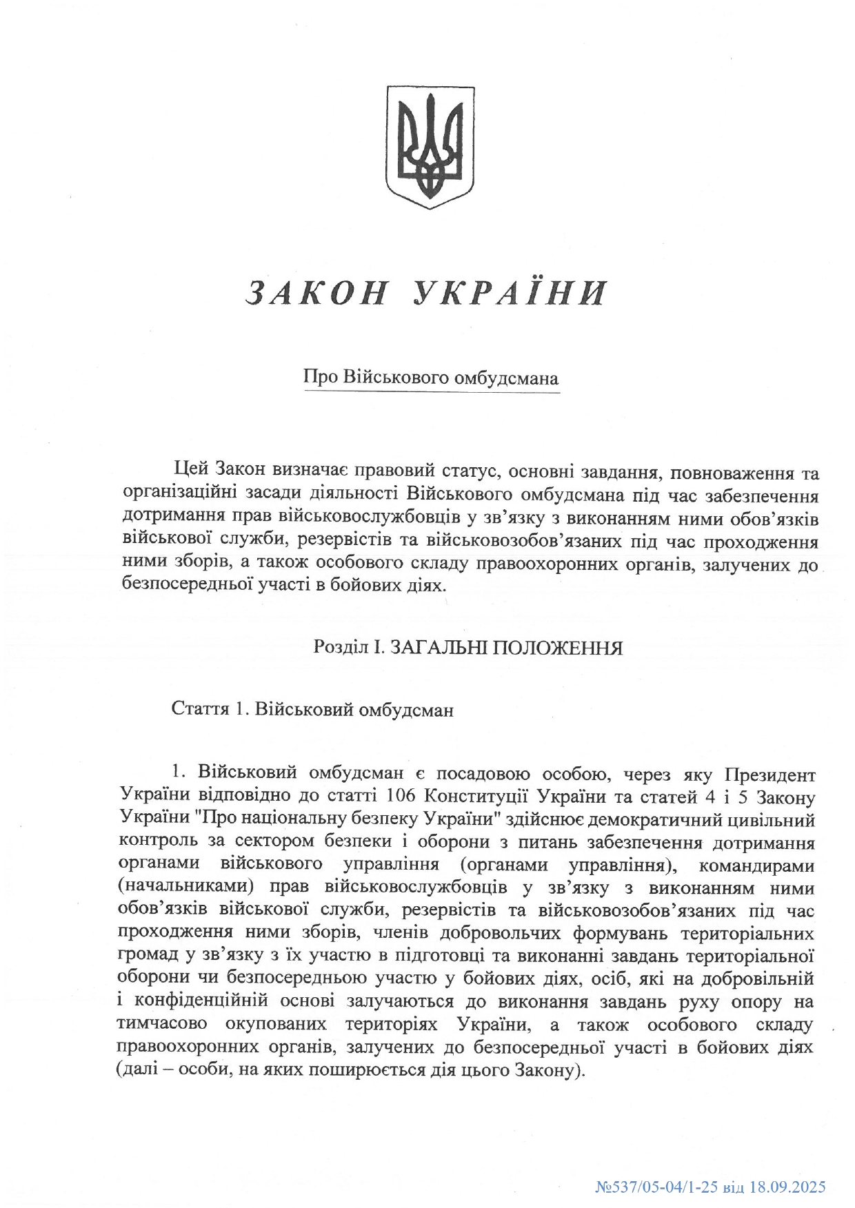 Підписано Закон, прийнятий Верховною Радою України від 3 вересня 2025 року № 4596-IX "Про військового омбудсмана".