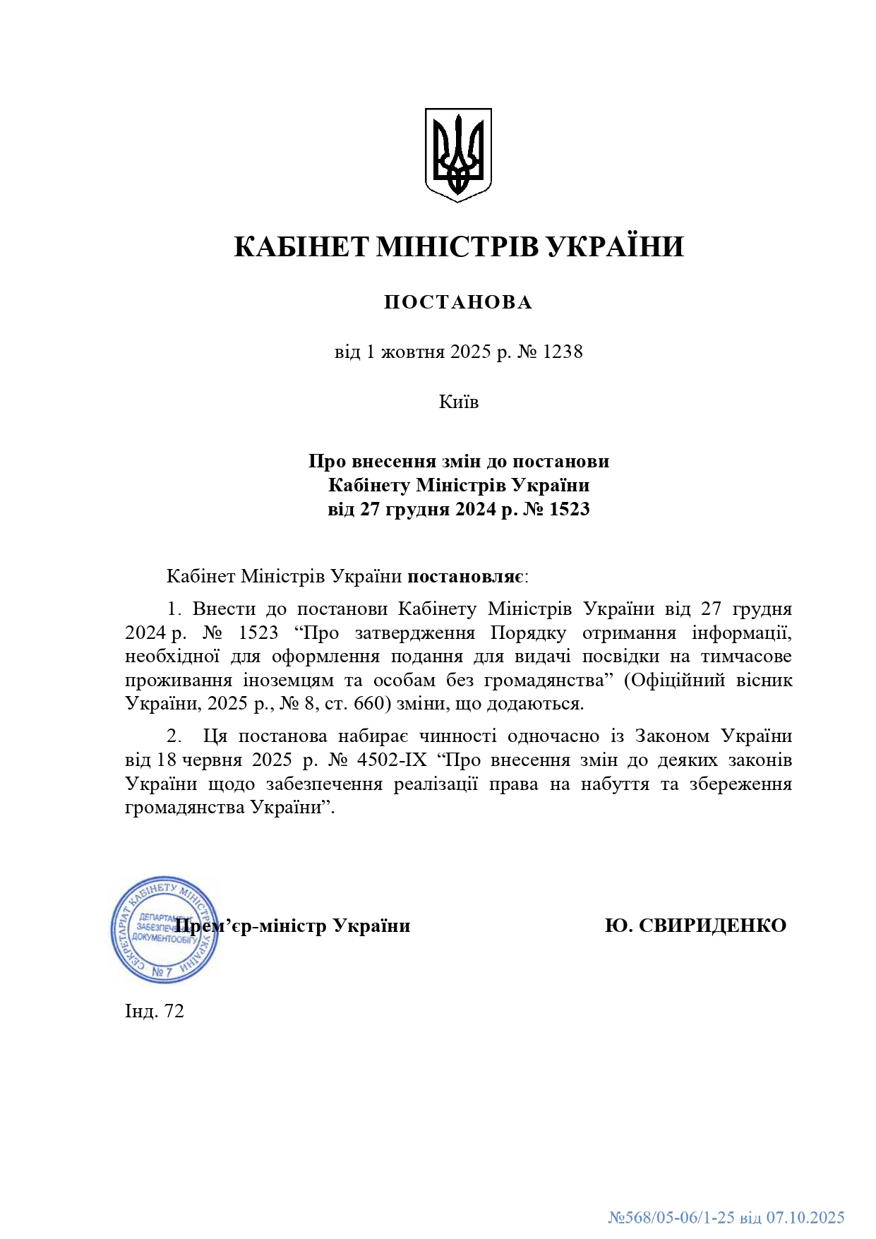 Кабінетом Міністрів України затверджено постанову від 1 жовтня 2025 року № 1238 "Про внесення змін до постанови Кабінету Міністрів України від 27 рудня 2024 р. № 1523”.