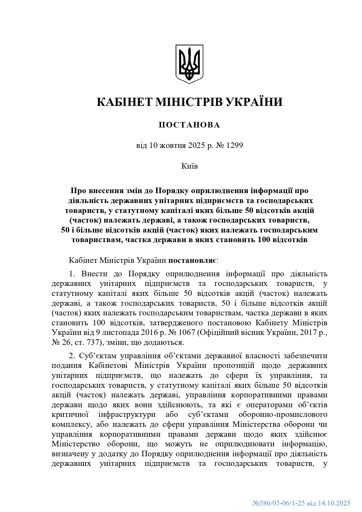 Кабінетом Міністрів України затверджено постанову від 10 жовтня 2025 року № 1299 "Про внесення змін до Порядку оприлюднення інформації про діяльність державних унітарних підприємств та господарських товариств, у статутному капіталі яких більше 50 відсотків акцій (часток) належать державі, а також господарських товариств, 50 і більше відсотків акцій (часток) яких належать господарським товариствам, частка держави в яких становить 100 відсотків”.