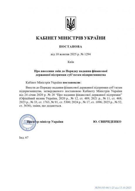 Кабінетом Міністрів України затверджено постанову від 10 жовтня 2025 року № 1294 "Про внесення змін до Порядку надання фінансової державної підтримки суб’єктам підприємництва”.