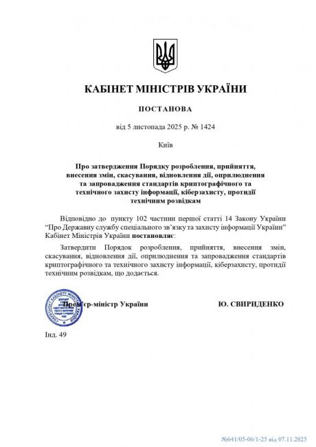 Кабінетом Міністрів України затверджено постанову від 5 листопада 2025 року № 1424 "Про затвердження Порядку розроблення, прийняття, внесення змін, скасування, відновлення дії, оприлюднення та запровадження стандартів криптографічного та технічного захисту інформації, кіберзахисту, протидії технічним розвідкам”.